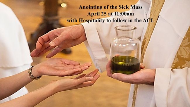 Join us for the Sacrament of Anointing on Saturday, April 25 at 11:00am. Hospitality to follow Mass in the ACL.
