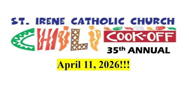 Due to the Church Renovations, the Chili Cook-Off has been rescheduled to April 11, 2026. If you have any questions regarding donations, sponsorships, volunteering, or being a contestant, please contact Jeff Schmitz at lcschmitz1@comcast.net.