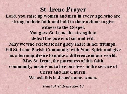 Irene means "Peace." This is why our parish logo is the "Dove of Peace." The dove carries an olive branch, a symbol of peace. After the flood, Noah set a dove forth to discover if the flood had subsided. From the ark, this dove continually returned with an olive branch in its mouth. God's covenant with His people was renewed after the flood.